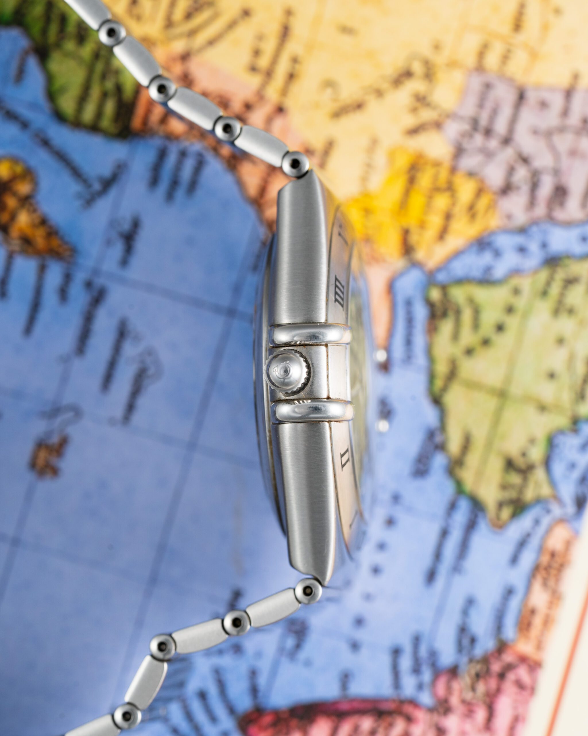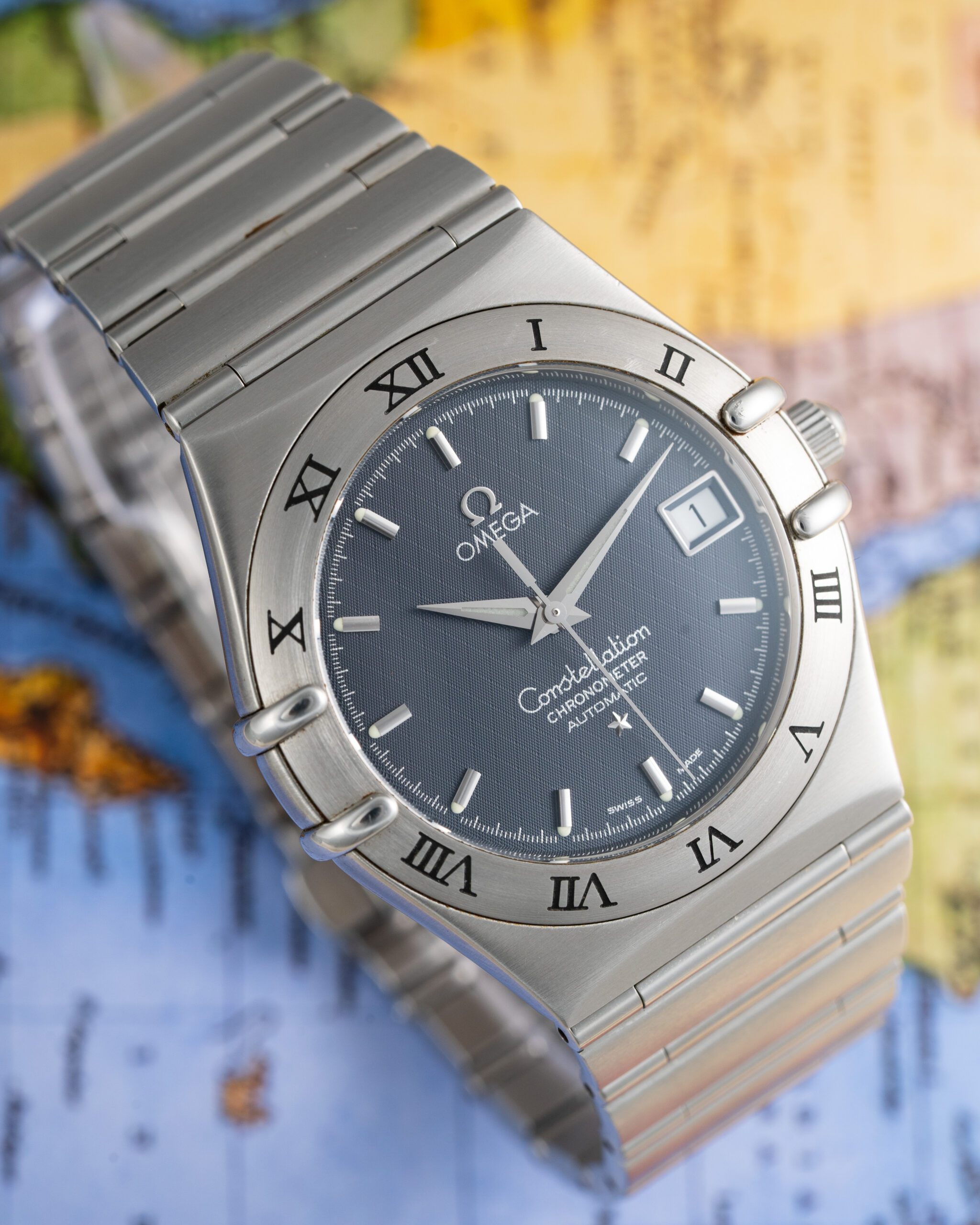 The Omega Constellation Automatic Ref. 368.1201 is a refined representation of Omega’s long-standing commitment to precision and design. This model, crafted in stainless steel with the signature “griffes” or claws at 3 and 9 o’clock, embodies the bold yet elegant style that defines the Constellation line. The dảk blue dial features applied indexes, a date window at 3 o’clock, and sleek dauphine hands, all housed under a sapphire crystal. With a 36mm case, it strikes a perfect balance in classic in appearance, yet substantial enough for modern tastes.